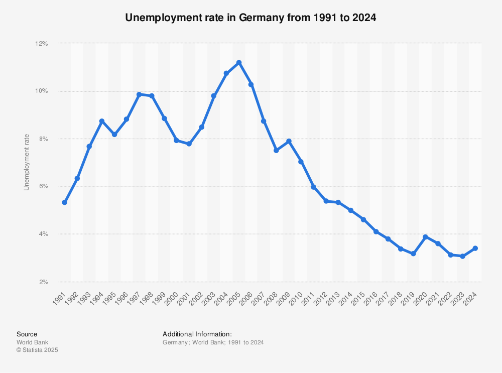 There are approximately 1.58 million unemployed people in Germany. The number of notified vacancies is 628,000. The unemployment rate has fluctuated in recent years. For example, in 2022 it was 3.12%, and in 2021 it was 3.59% according to Statista….